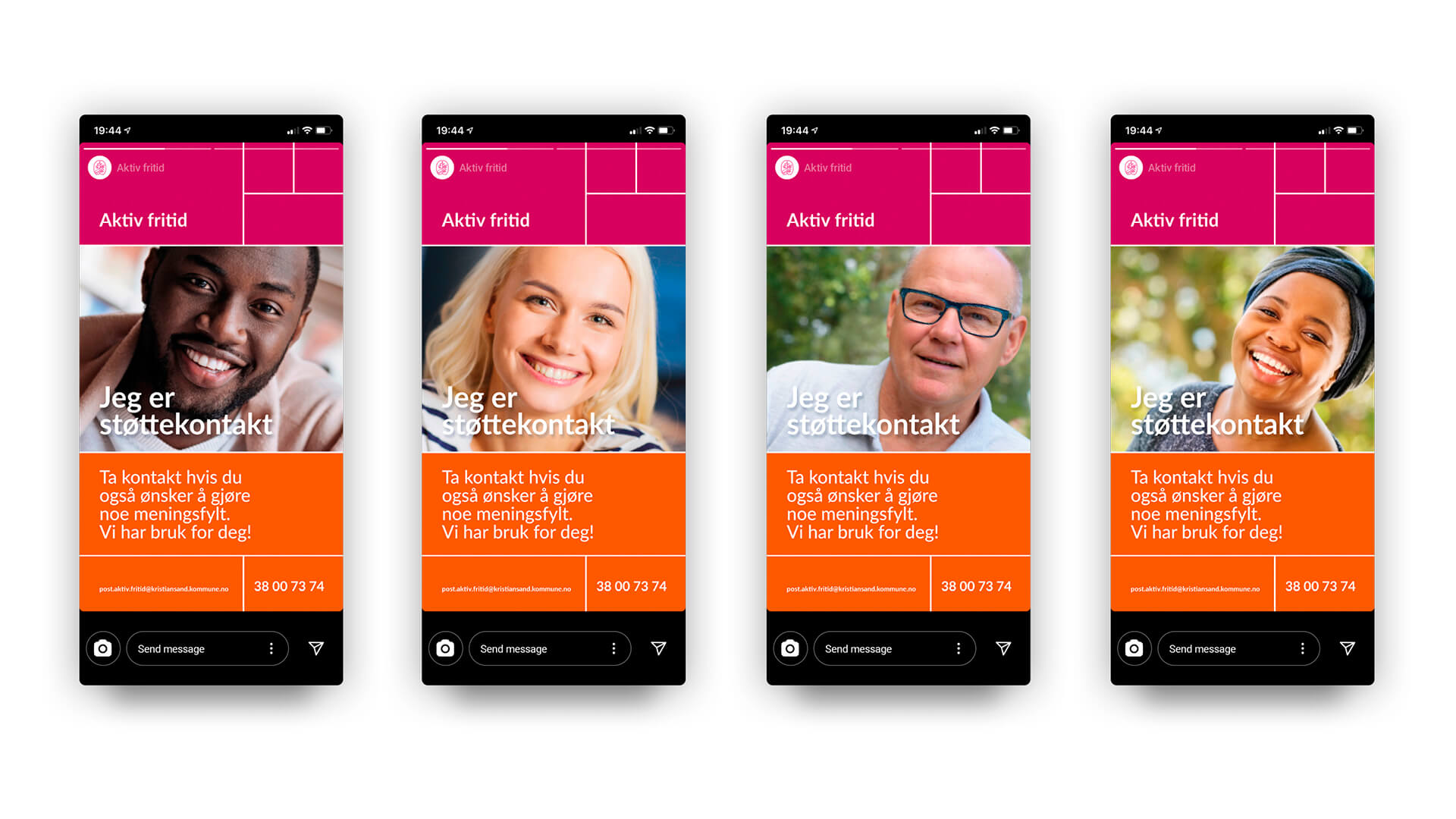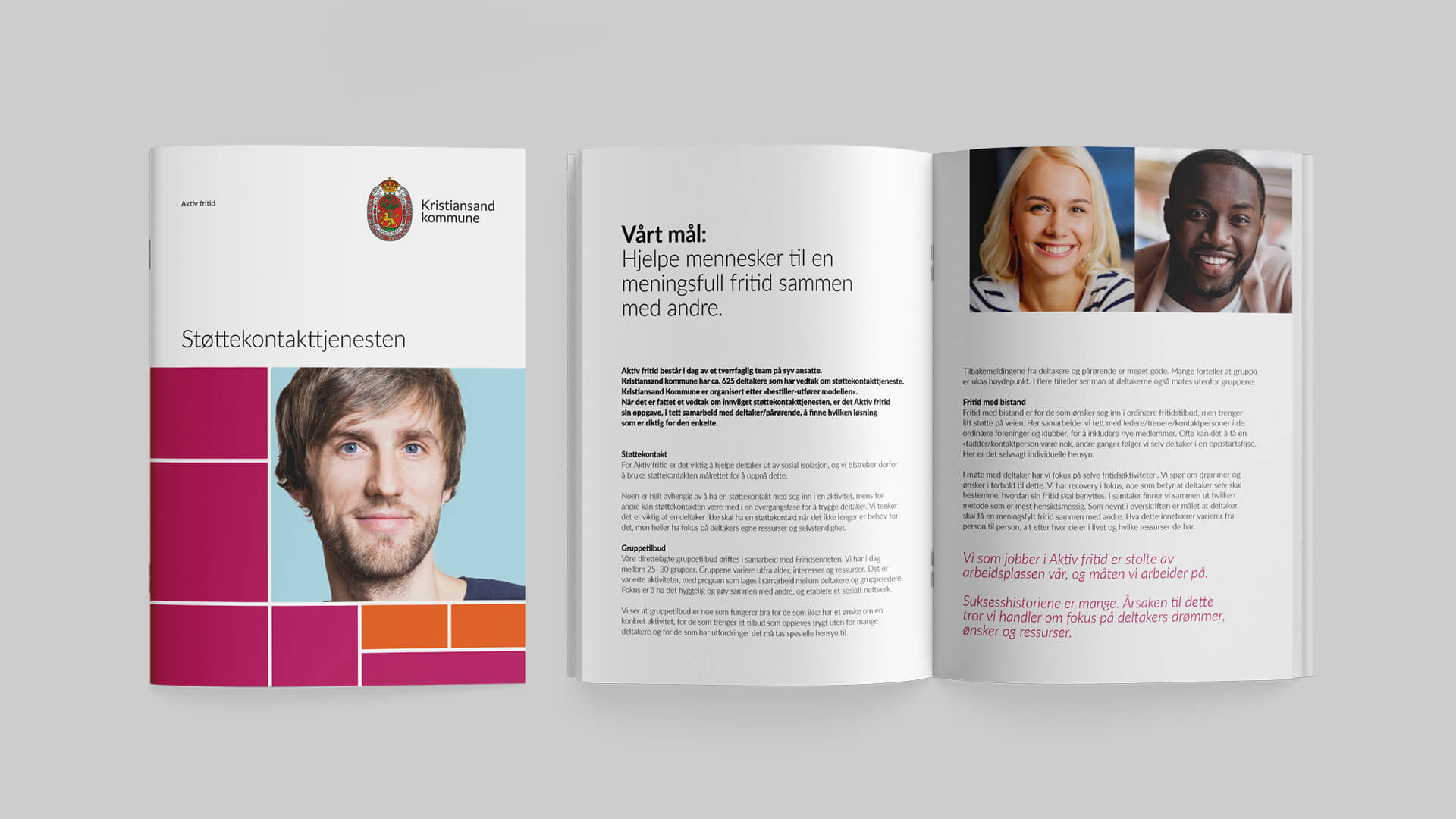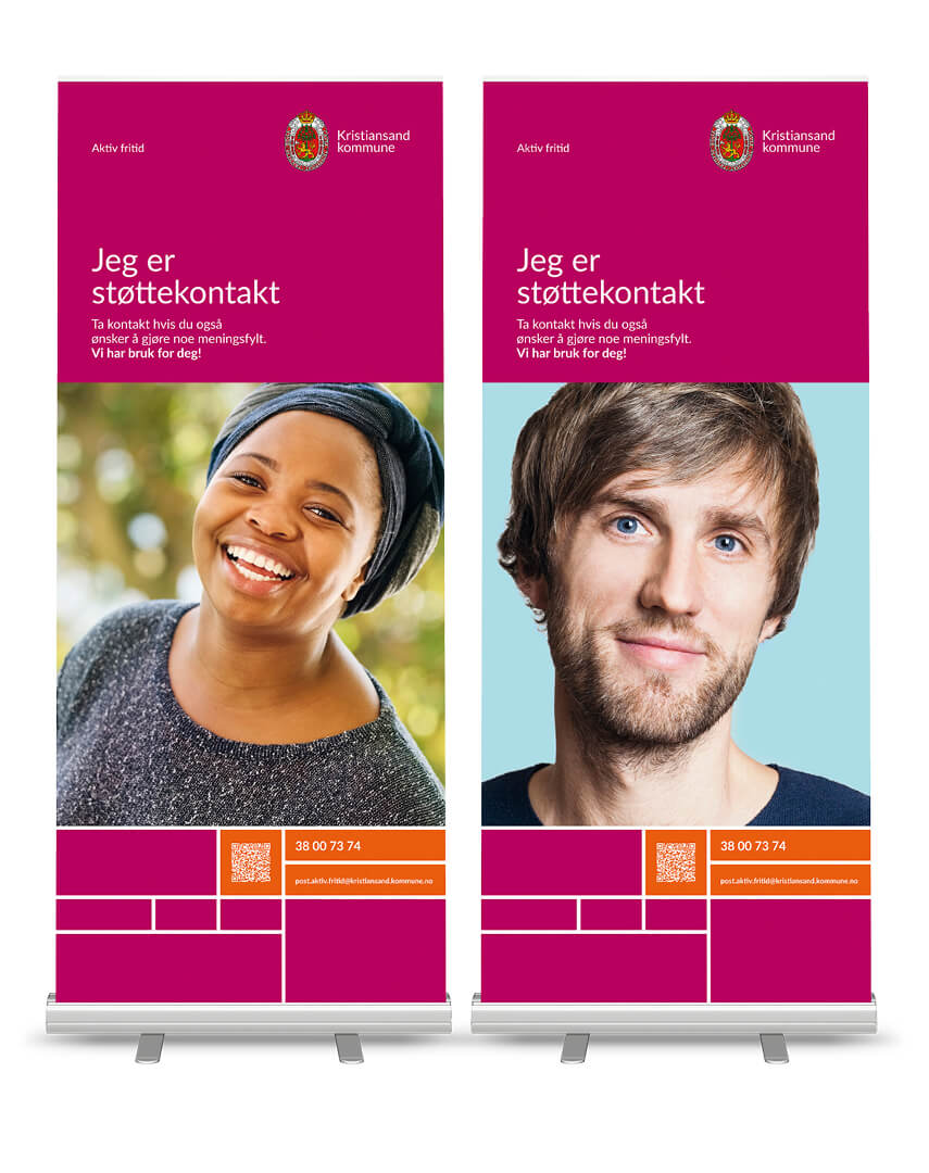 Støttekontakttjenesten Aktiv fritid har som mål å hjelpe mennesker til en meningsfull fritid sammen med andre. De tilbyr støttekontakter, tilrettelagte gruppetilbud og samarbeider med de ordinære fritidstilbudene som finnes. Med bruk av Kristiansand kommunes profil har vi laget en kampanje for å få flere til å ønske å bli støttekontakt.