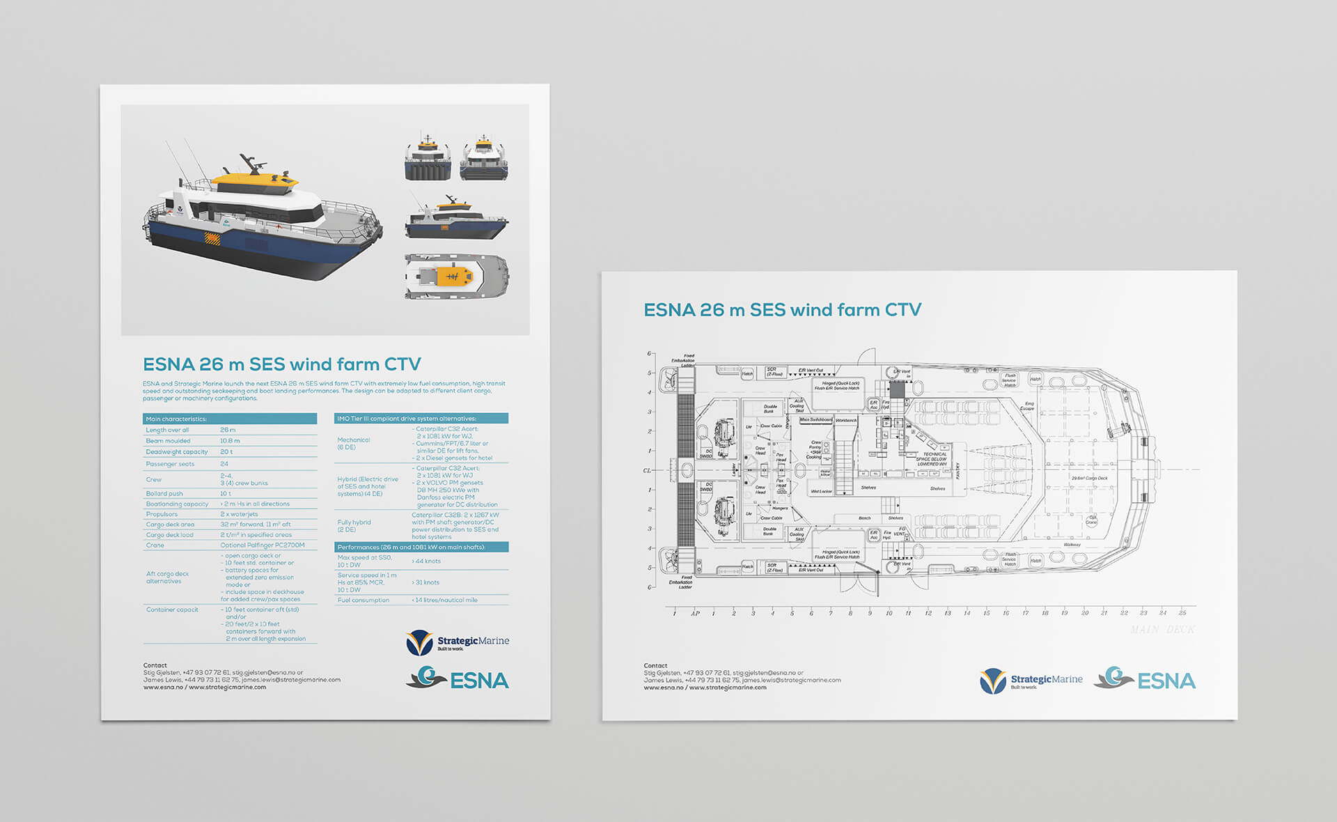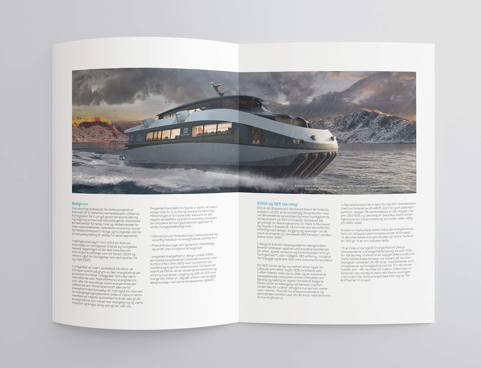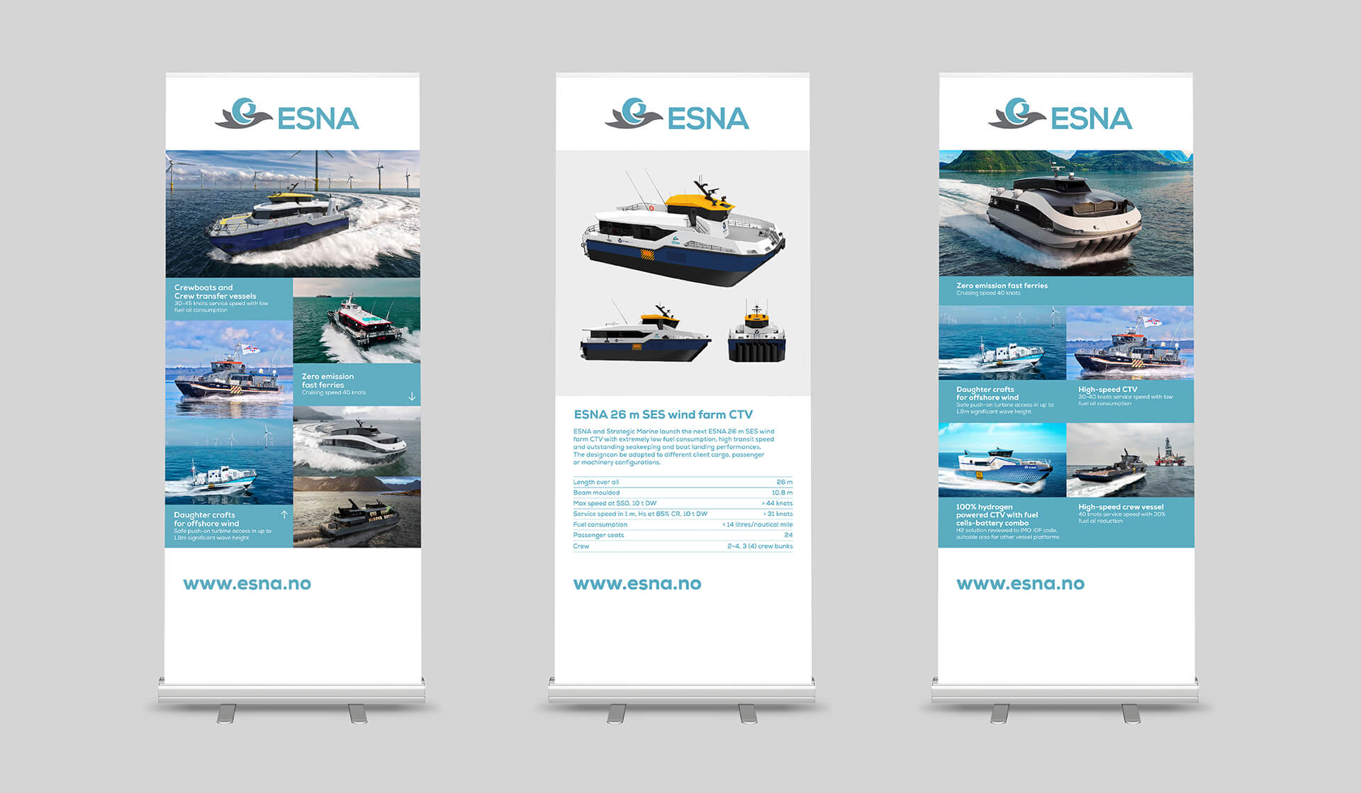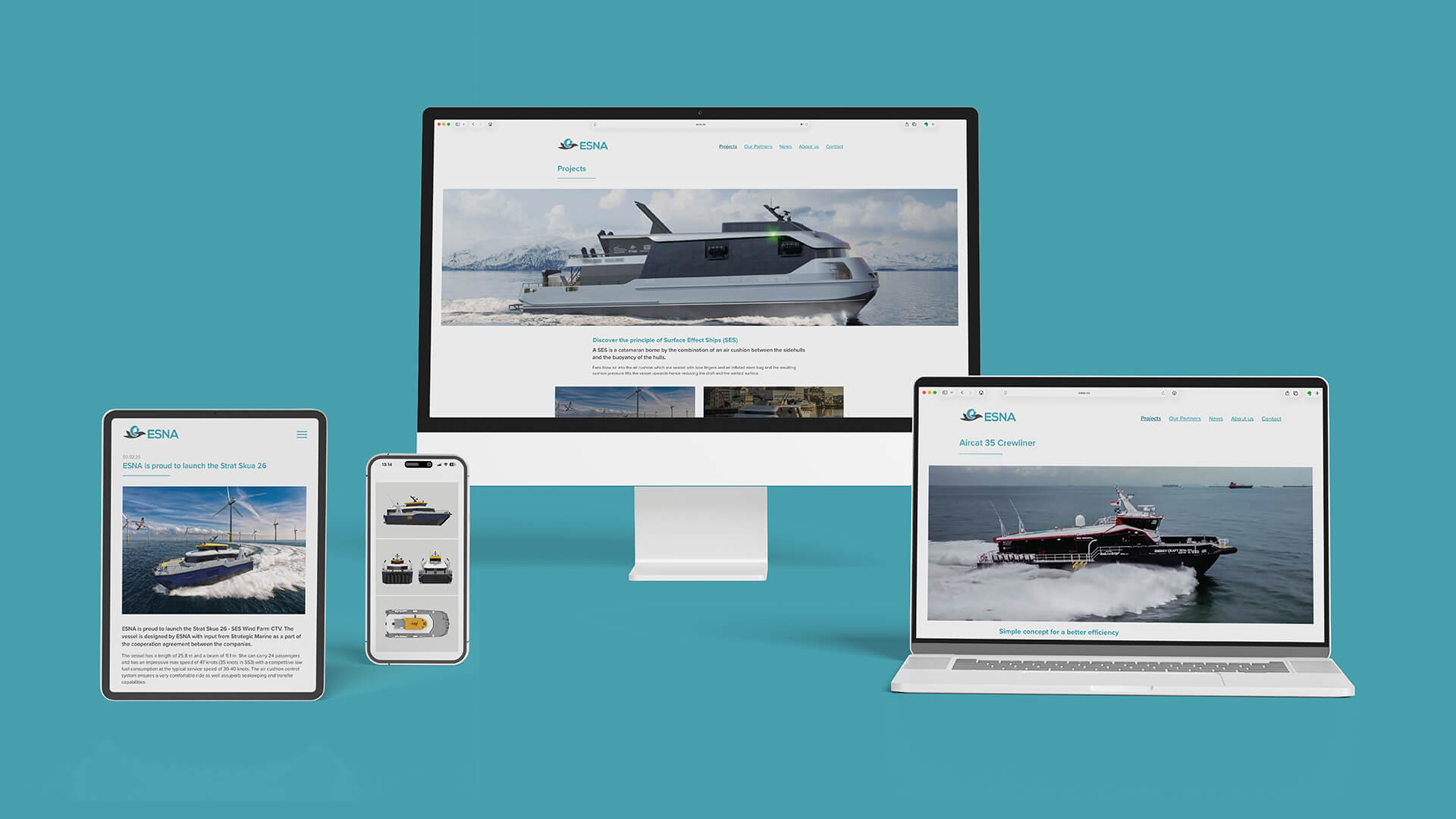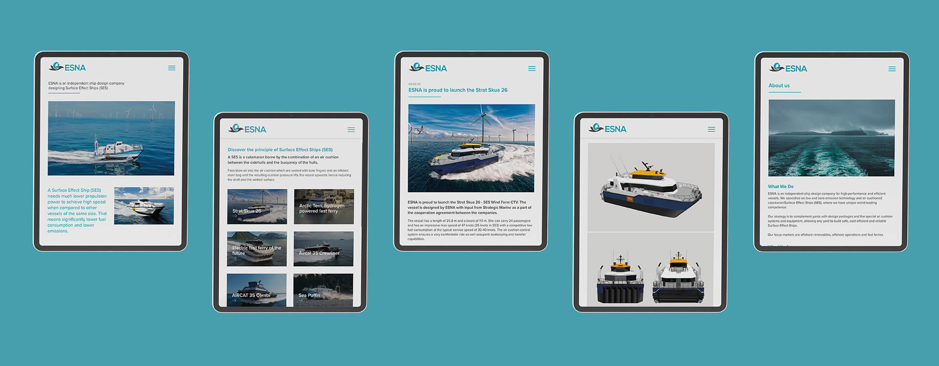 ESNA er et skipsdesignselskap som utvikler høytytende og effektive fartøy. Selskapet har spisskompetanse på lav- og nullutslippsteknologi, samt luftputekatamaraner og Surface Effect Ships (SES), hvor de besitter verdensledende kompetanse. Vi har utviklet nettsiden og produsert diverse materiell for dem.