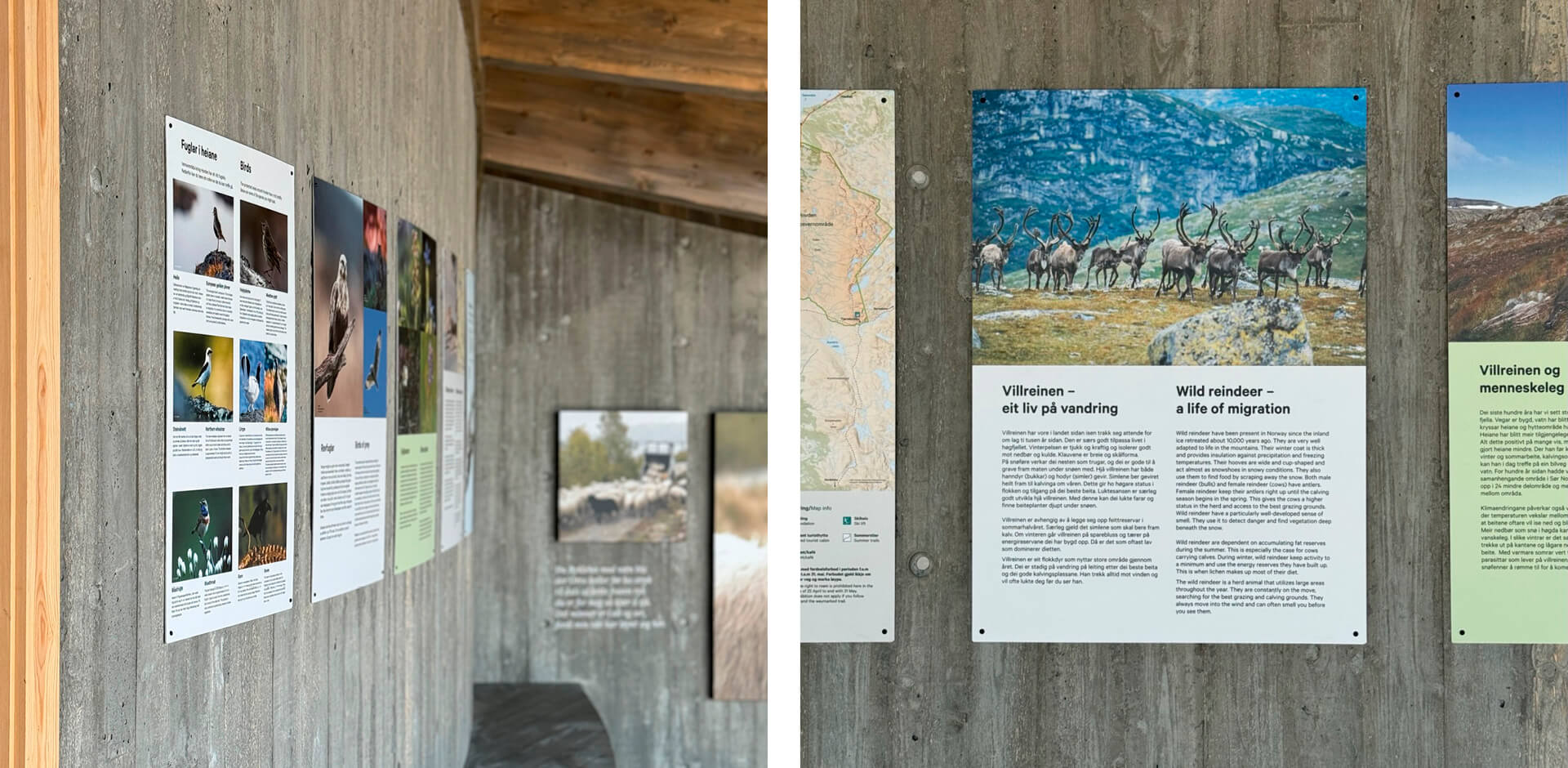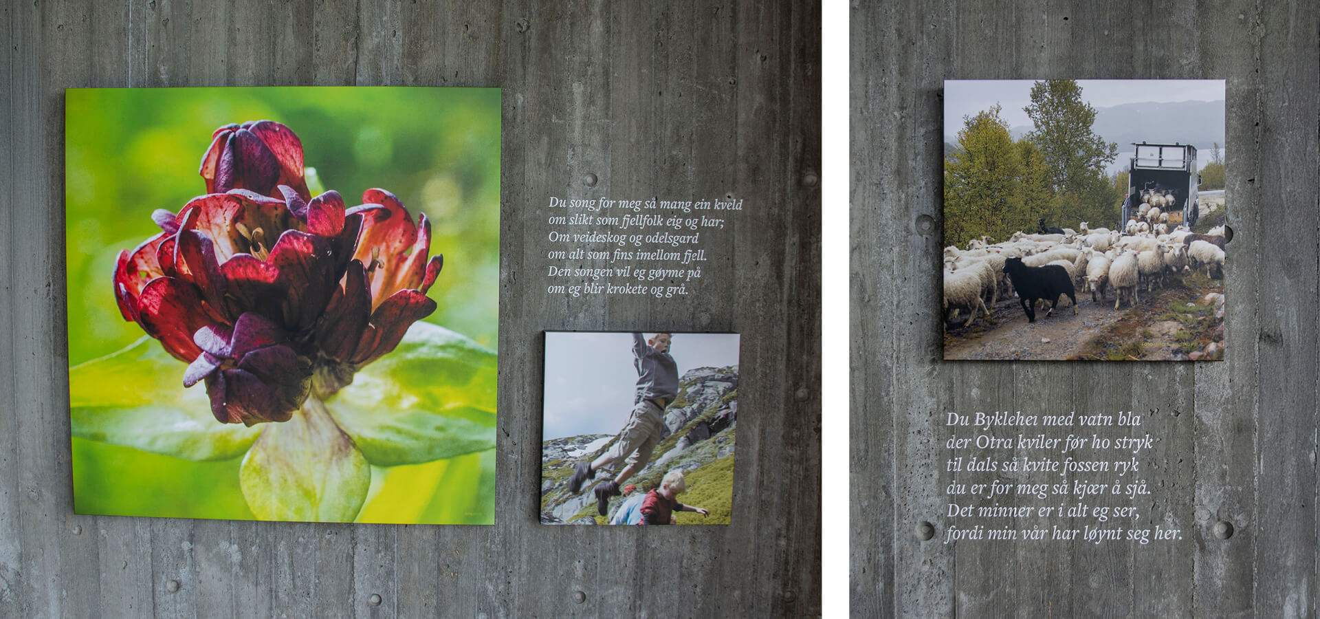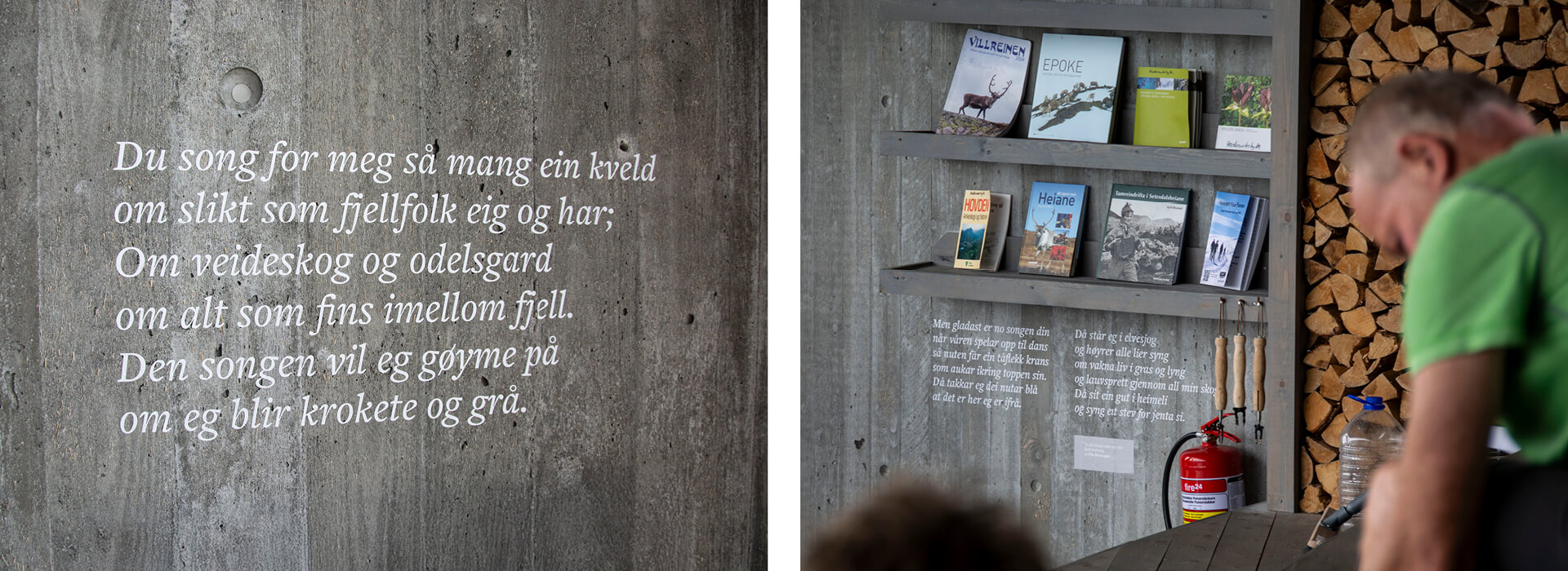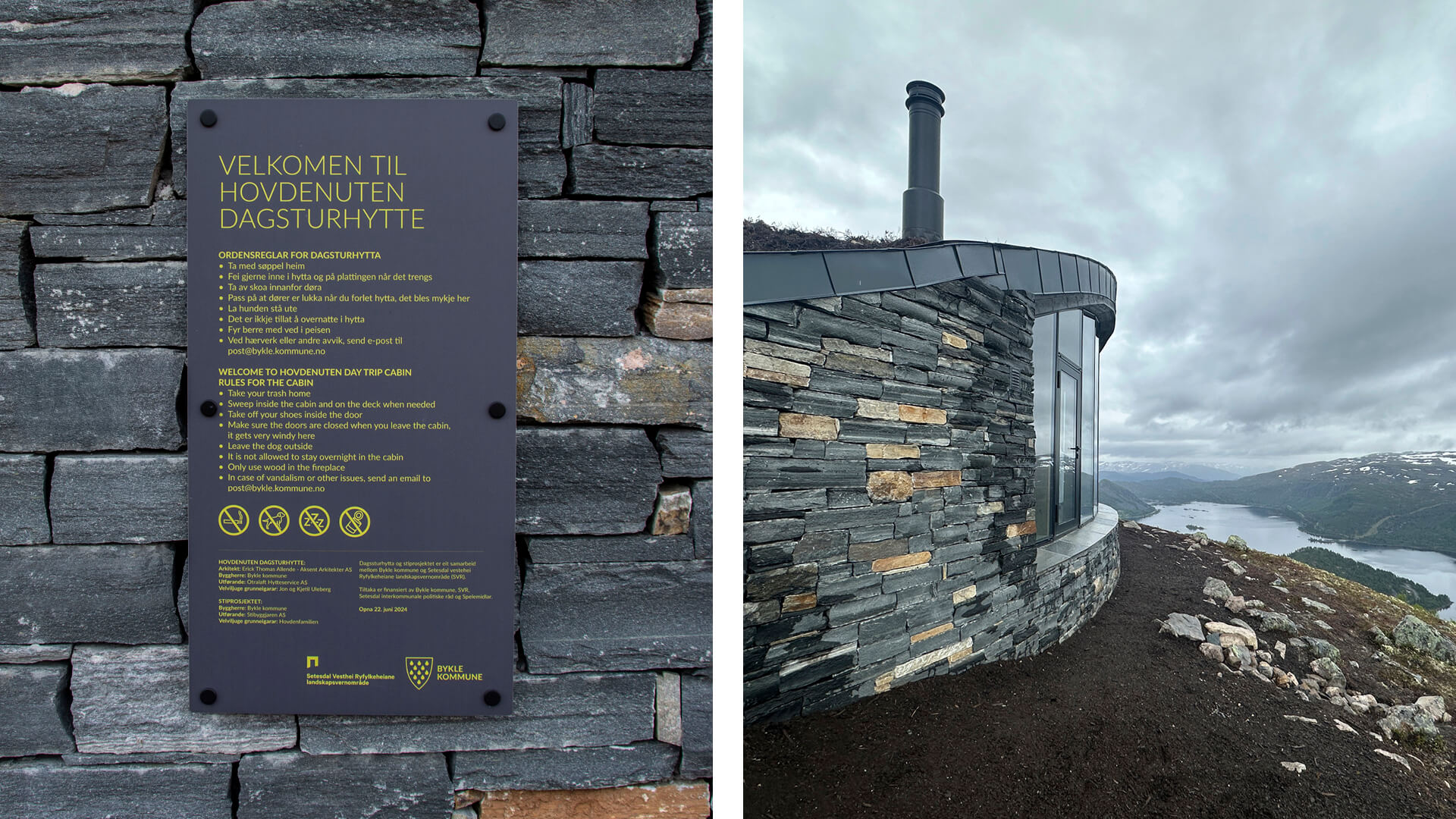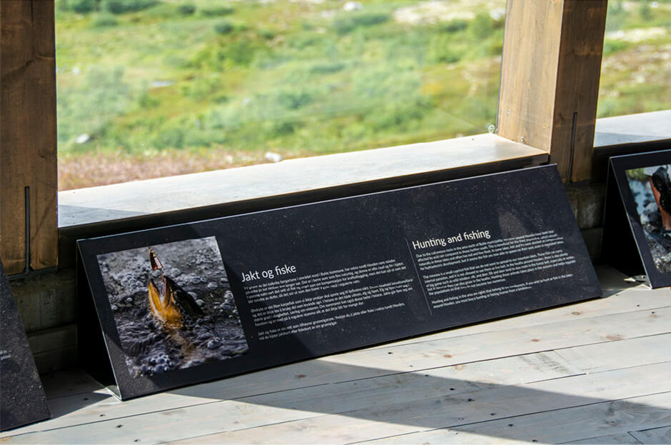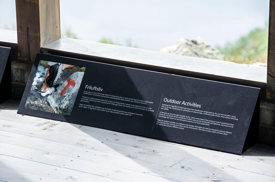 Hovdenuten dagsturhytte ligger 1119 m over havet, på toppen av Hovdenuten i Bykle kommune. Dagsturhytta ble bygd med formål om å kanalisere ferdsel og redusere slitasje i sårbare naturområder, samt gjøre Hovdenuten tilgjengelig for flere. Vi har designet skilt og utsmykning både utenfor og inni hytta.