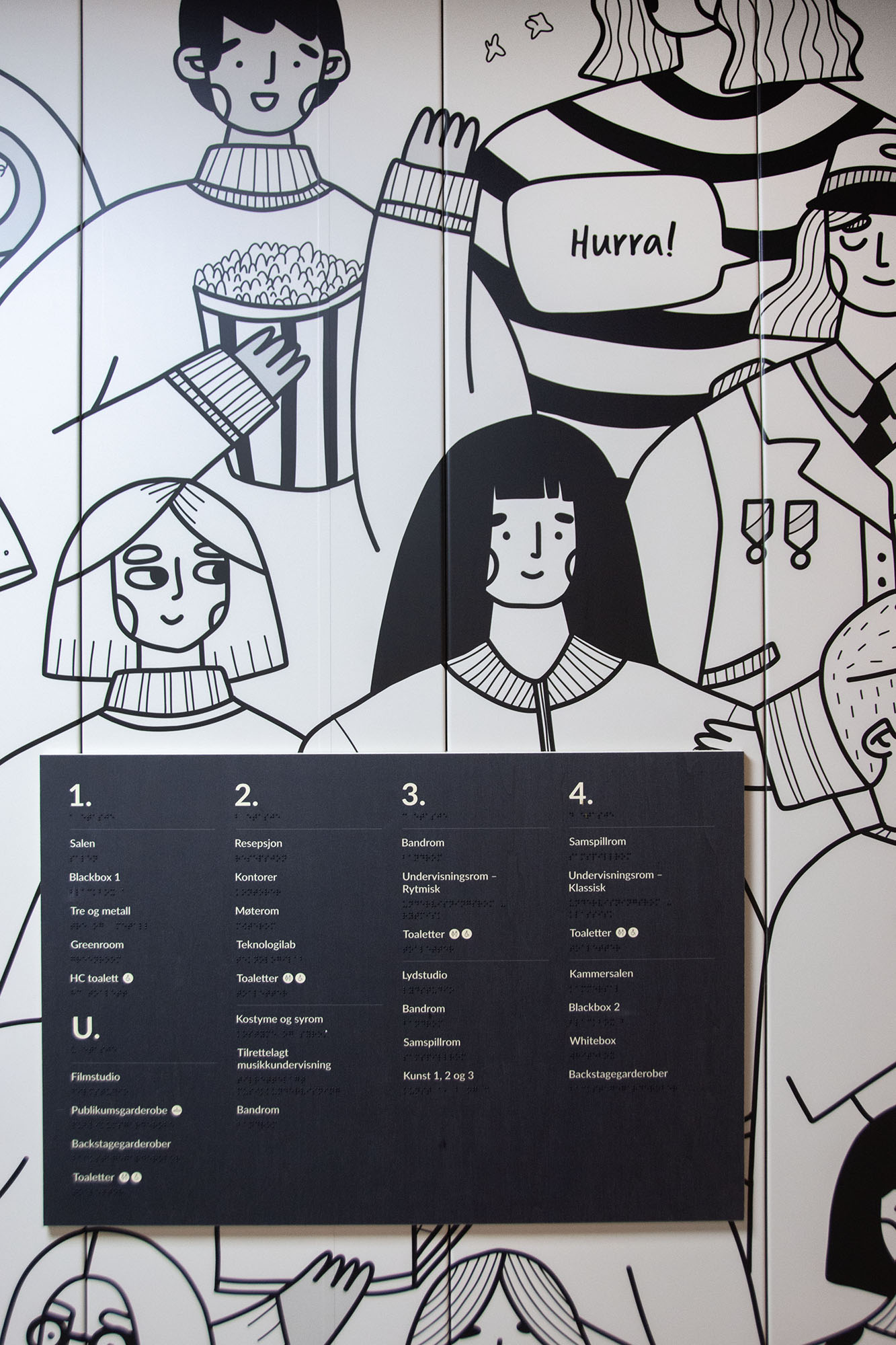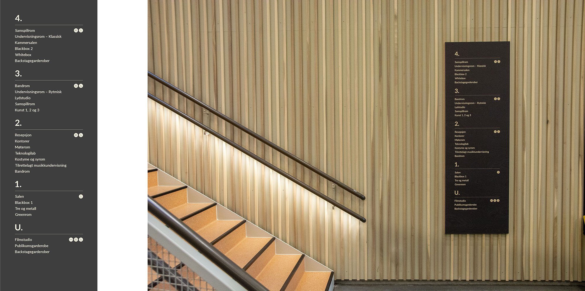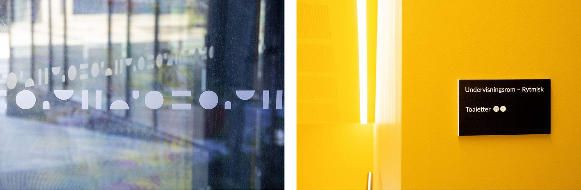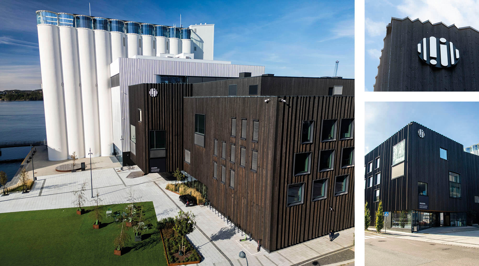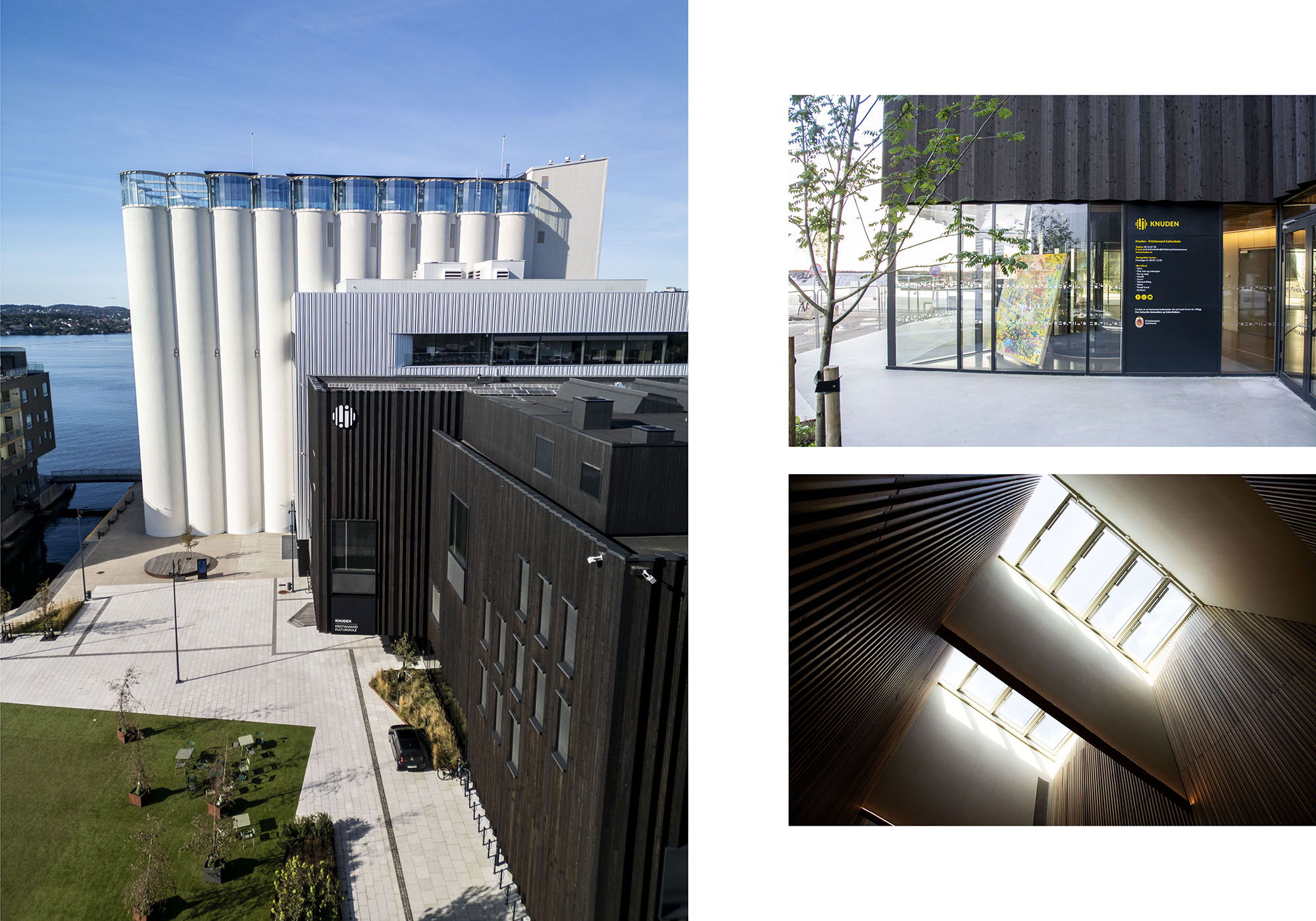 Da Knuden skulle flytte til Silokaia i Kristiansand i 2022 fikk vi oppdraget med å skilte og utsmykke det nye bygget. Dette omfattet alt fra utendørsskilt og vindusdekor til innendørsskilt og veifinning. Vi utviklet et ikonsett og valgte materialer som formidler både varme og tydelighet. Finerplatene brukt innendørs gir skiltene en levende overflate og et spennende uttrykk på kantene.