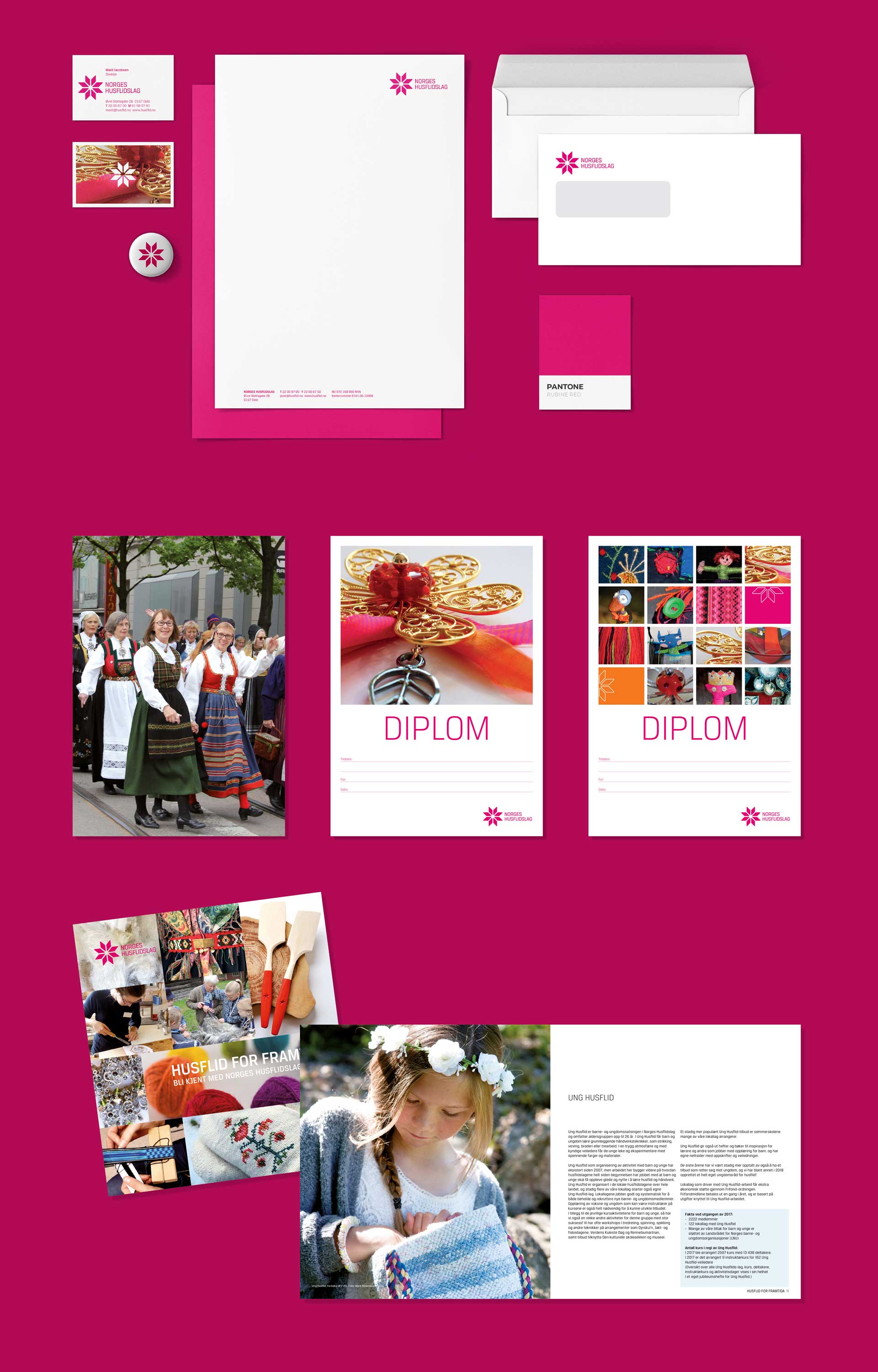 Vi har designet Norges Husflidslag sin visuelle identitet. Under paraplyen til Norges Husflidslag finner man også lokallagene, Norske Husflidshåndverkere og Ung Husflid. Disse underavdelingene defineres med samme symbol, men med hver sin farge. Til tross for ulike farger er likheten og samhørigheten i profilen så sterk at man ikke er i tvil om avsender.